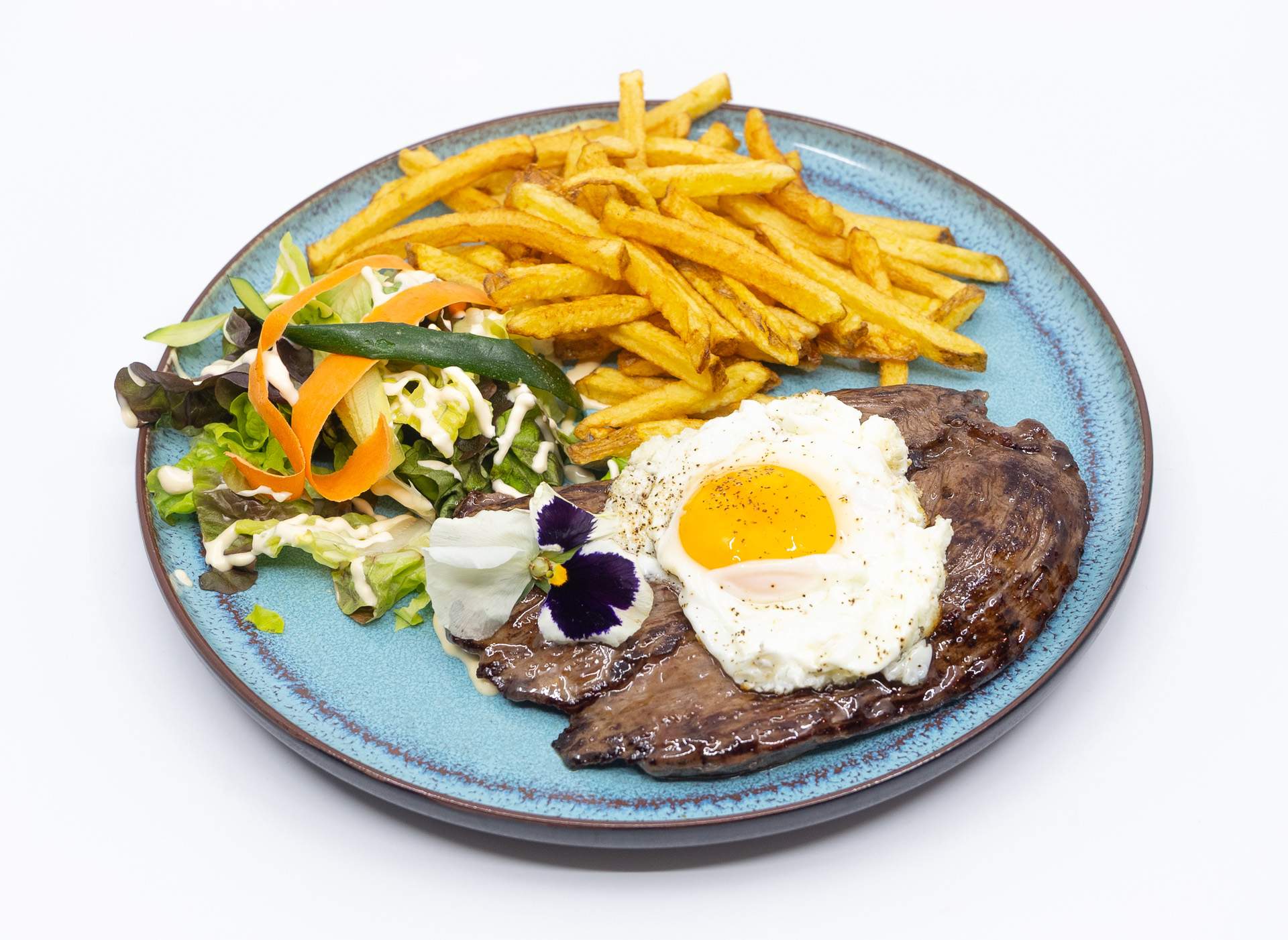 | Bitoque viande de bœuf, œuf au plat, frites, riz, salade |