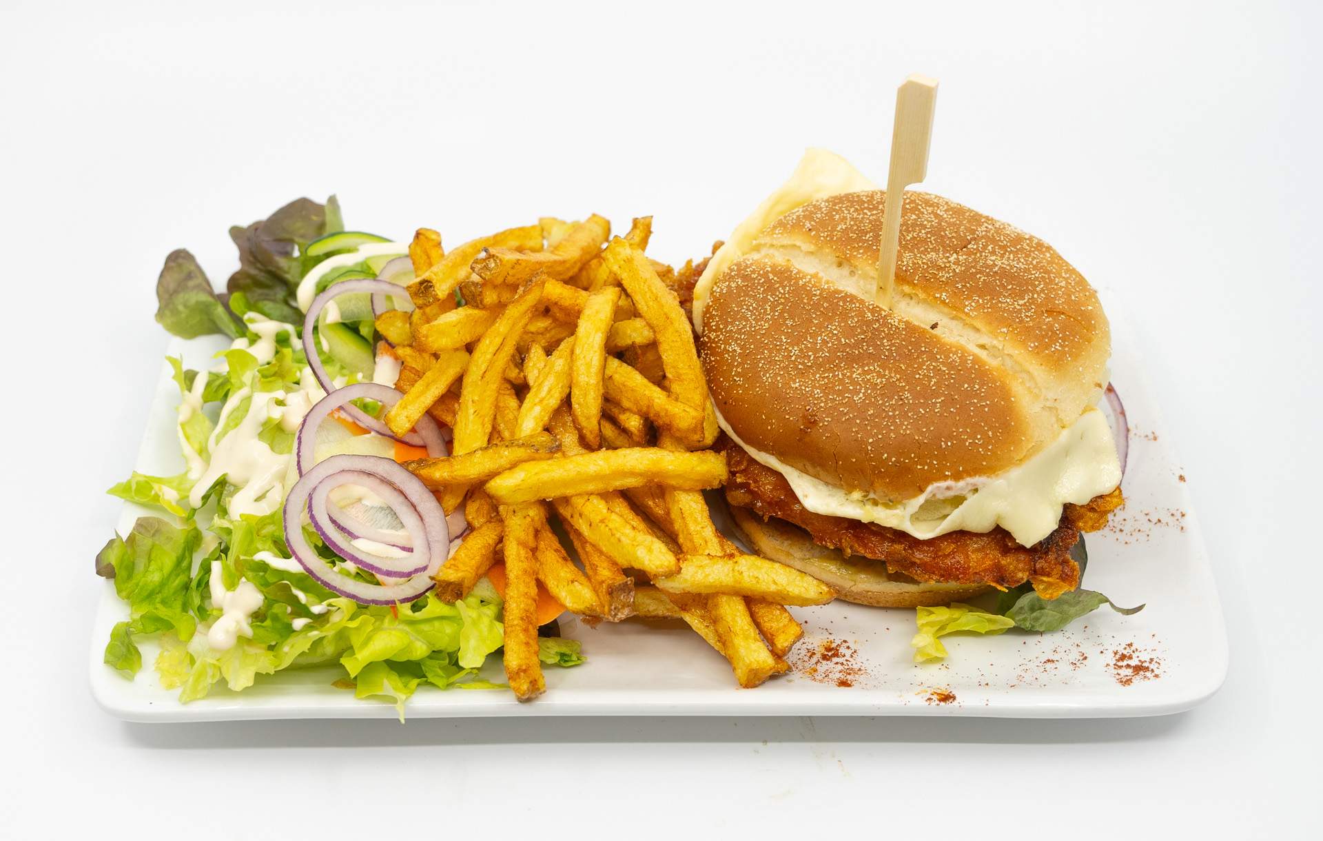 | Burger Conquistador poulet pané, tomates, salade, oignons, sauce tartare maison, frites maison |